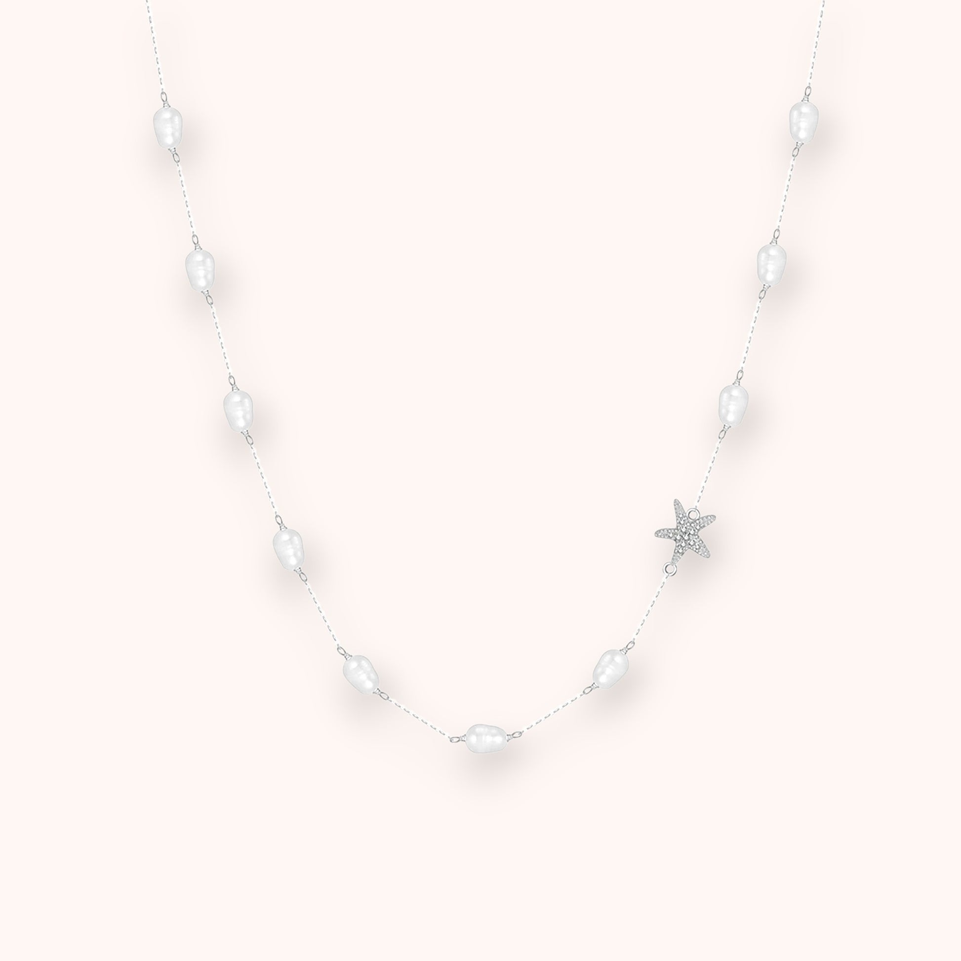 A delicate necklace featuring natural freshwater pearls and a sparkling star charm set with AAAA cubic zirconia. Crafted in genuine 925 sterling silver, this piece offers a soft, elegant glow — perfect for layering or wearing on its own.