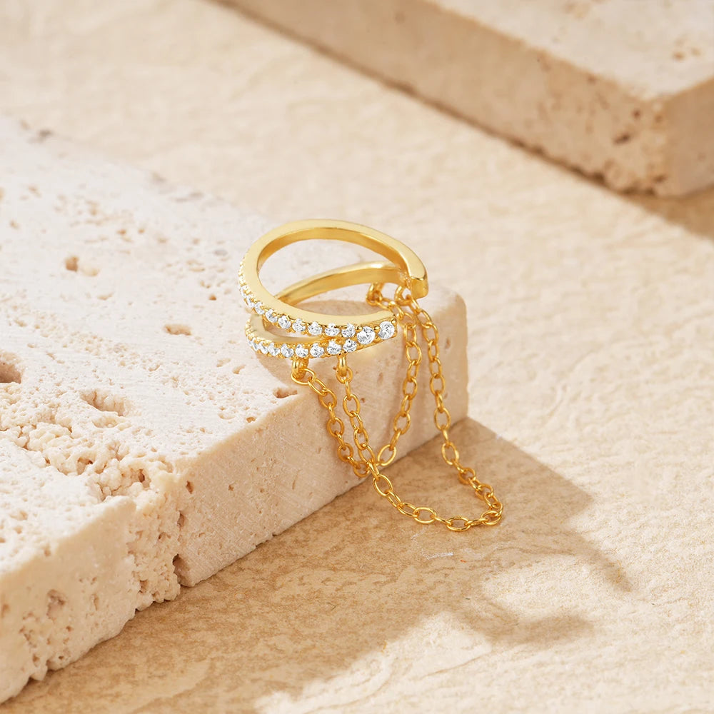 A bold and elegant ear cuff crafted in 925 sterling silver with a gold-plated finish. Designed with sparkling AAAAA zirconia and cascading chains, this statement piece adds a modern, elevated touch to your ear stack — no piercing needed.