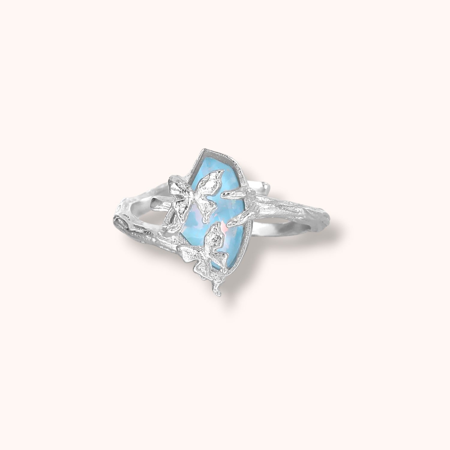 A delicate, ocean-inspired open ring that catches the light with a soft blue shimmer. Nature-shaped branches wrap around the zircon stone, creating a dreamy coastal feel.