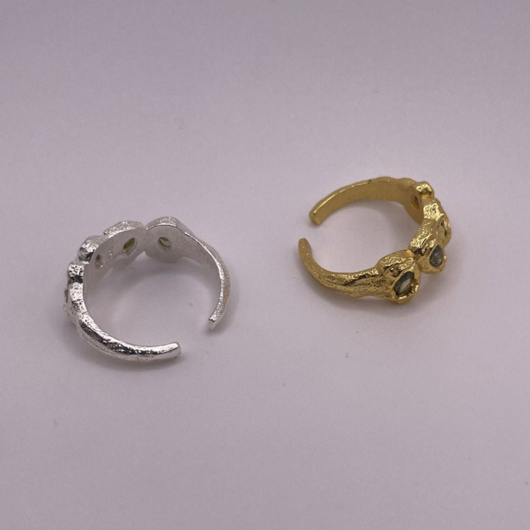 Unleash bold elegance with this Molten Gold Adjustable Ring, crafted from 925 sterling silver and finished with a richly textured, organic gold surface. Featuring four black oval stones embedded in molten-inspired settings, this ring brings a vintage yet modern edge to any look.