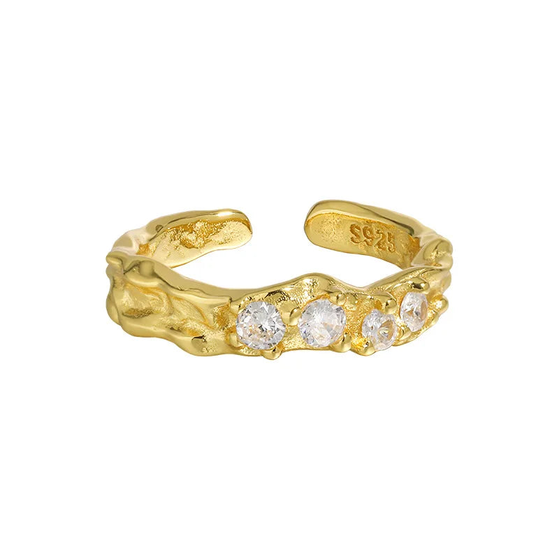 This unique open ring is crafted in 925 sterling silver with shimmering zircon stones. The textured band design adds a bold, organic feel while keeping it lightweight and comfortable for daily wear.