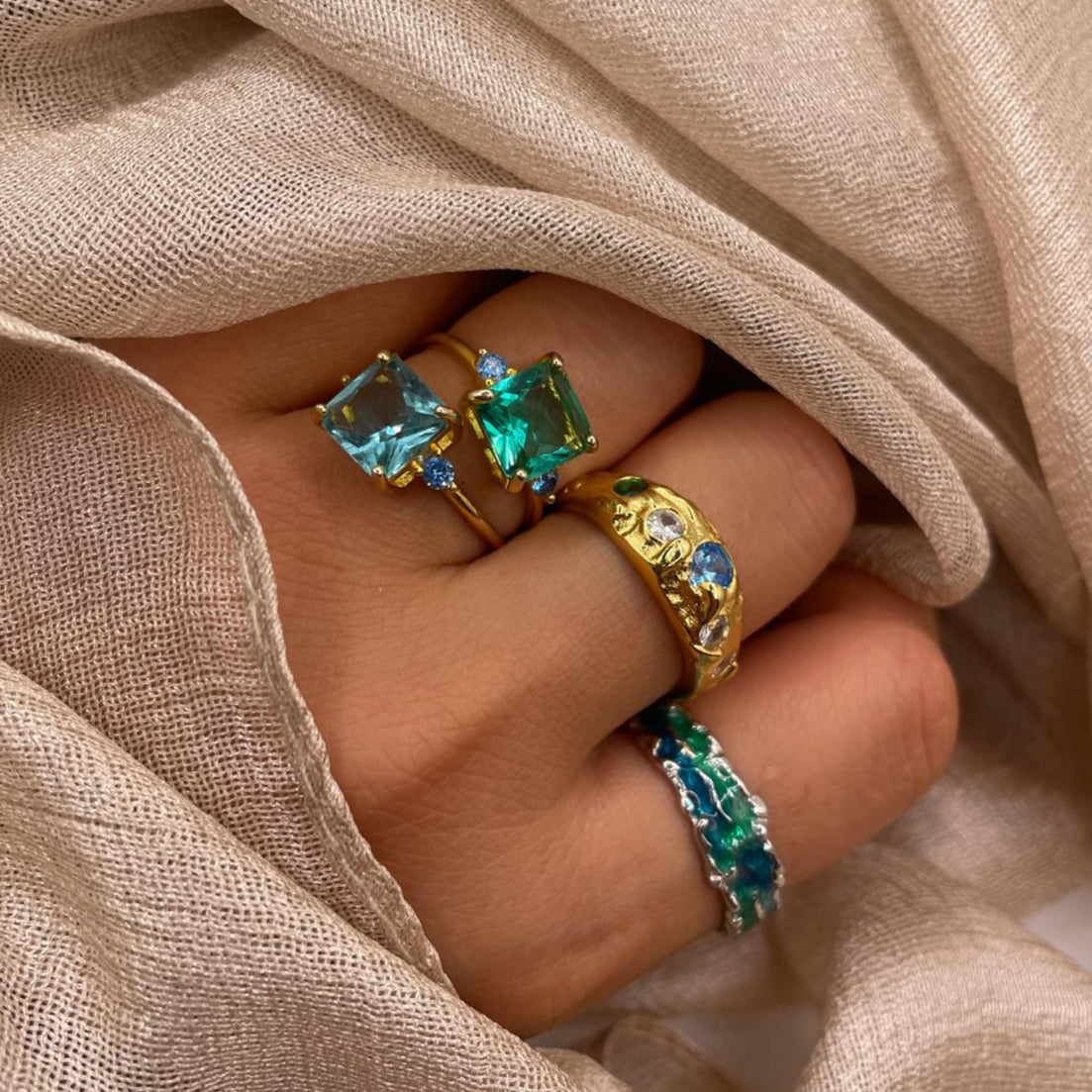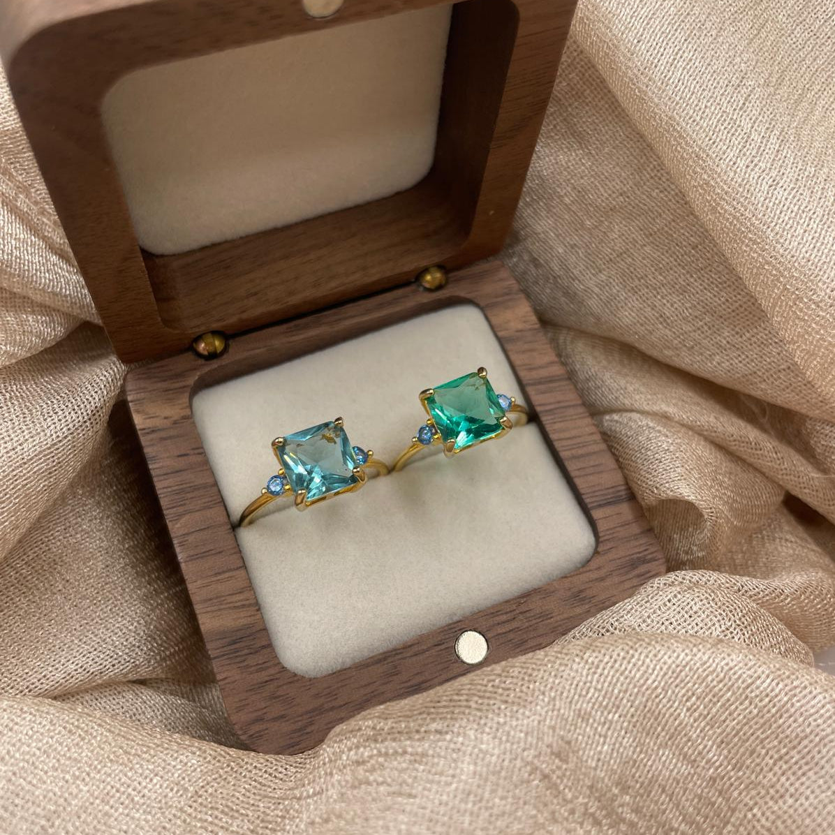 Designed to capture the serene beauty of tropical waters, this ring features a radiant square-cut Crystal (zircon) in vibrant aqua blue or emerald green, complemented by mini side stones for added sparkle.