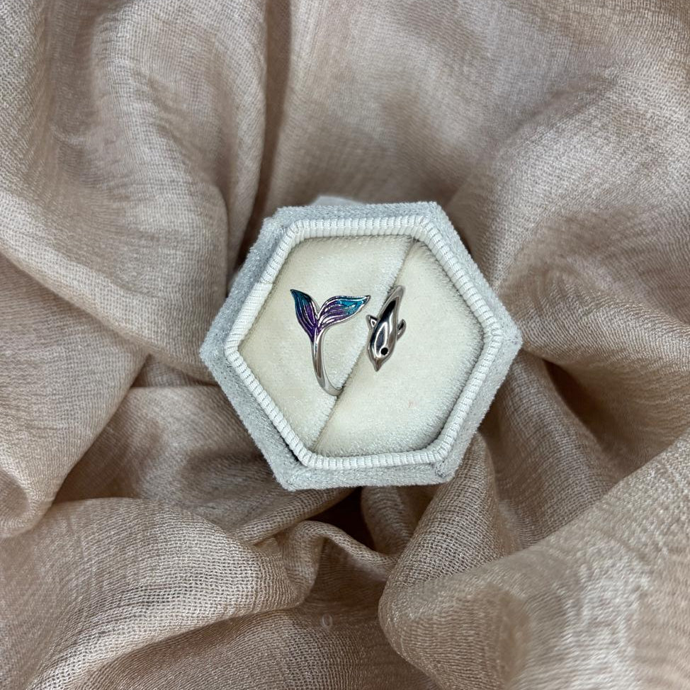 A delicate open ring featuring a graceful dolphin meeting a shimmering mermaid tail — a little reminder of the sea you can wear every day. Adjustable, light, and perfect for adding a touch of ocean magic to your look.