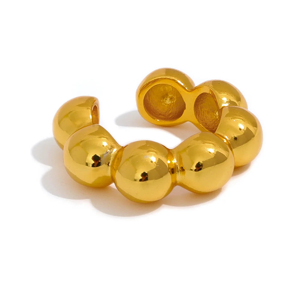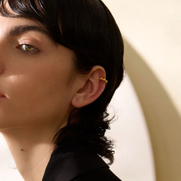 This modern ear cuff features a row of smooth, rounded beads in a clean geometric form — polished to a mirror-like finish.