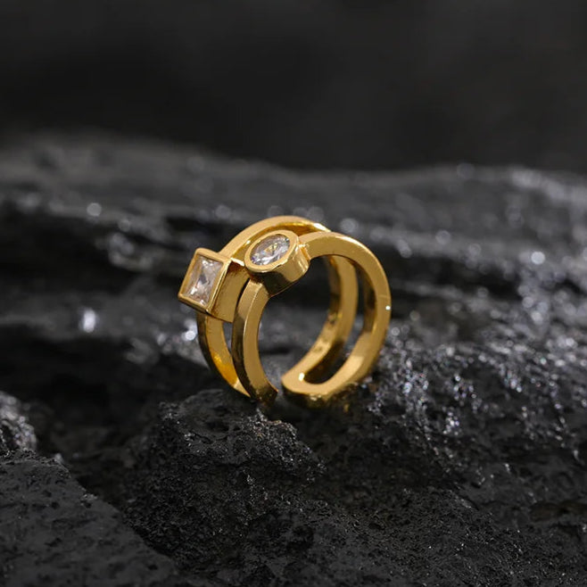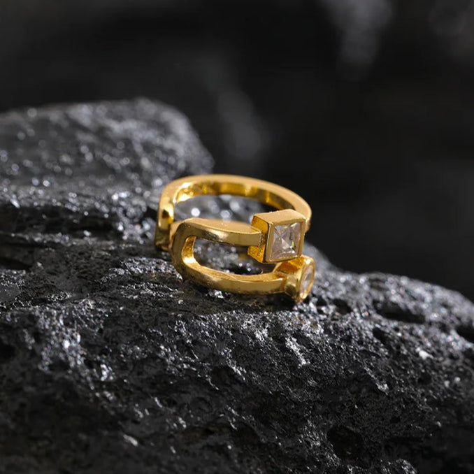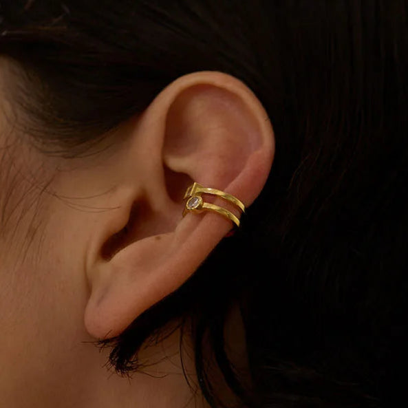 This elegant double-line ear cuff is crafted from high-quality 925 sterling silver and finished in radiant gold. Featuring two shimmering zircon stones — one round, one square — this piece is perfect for layering or wearing solo for effortless style.